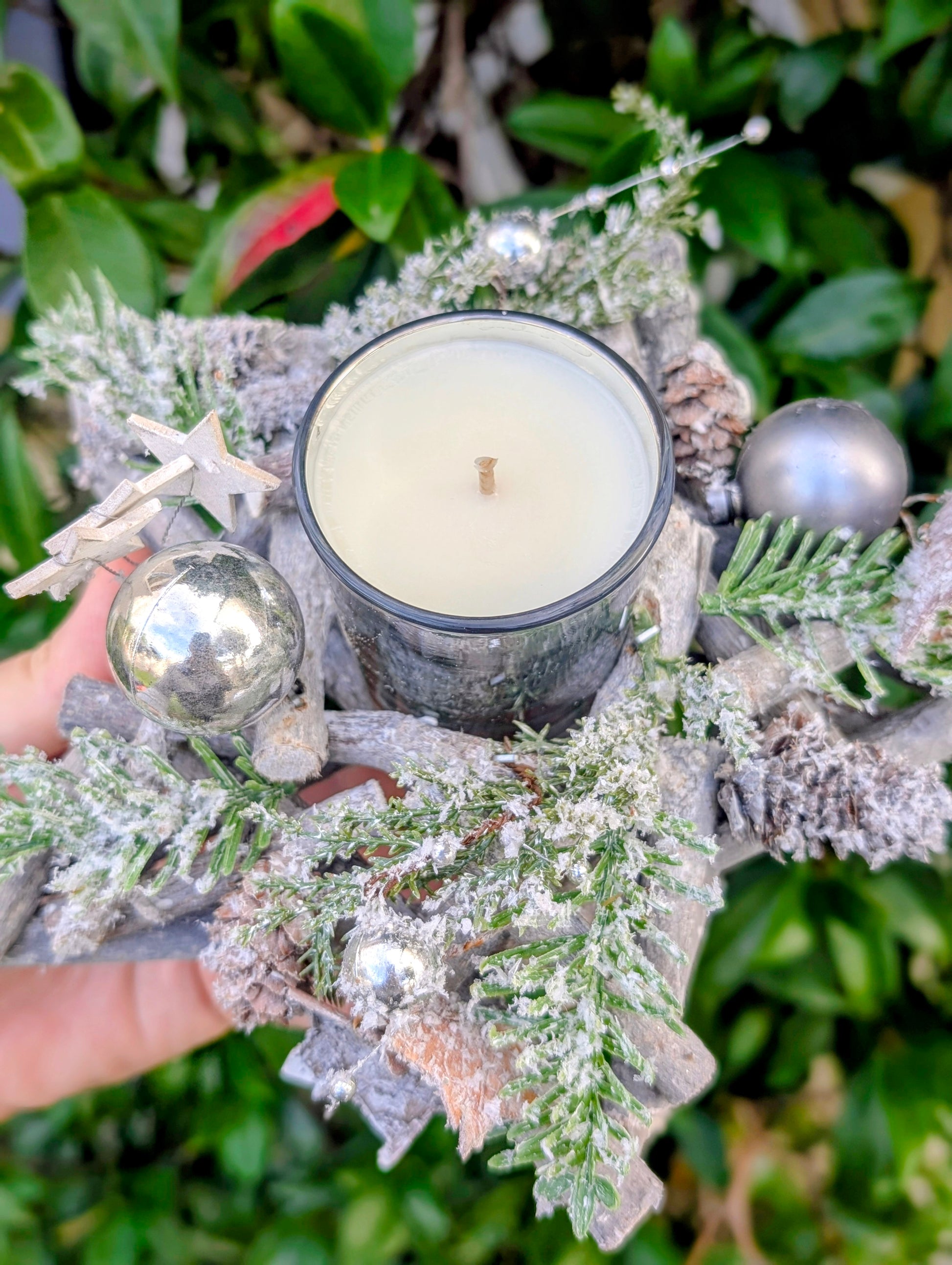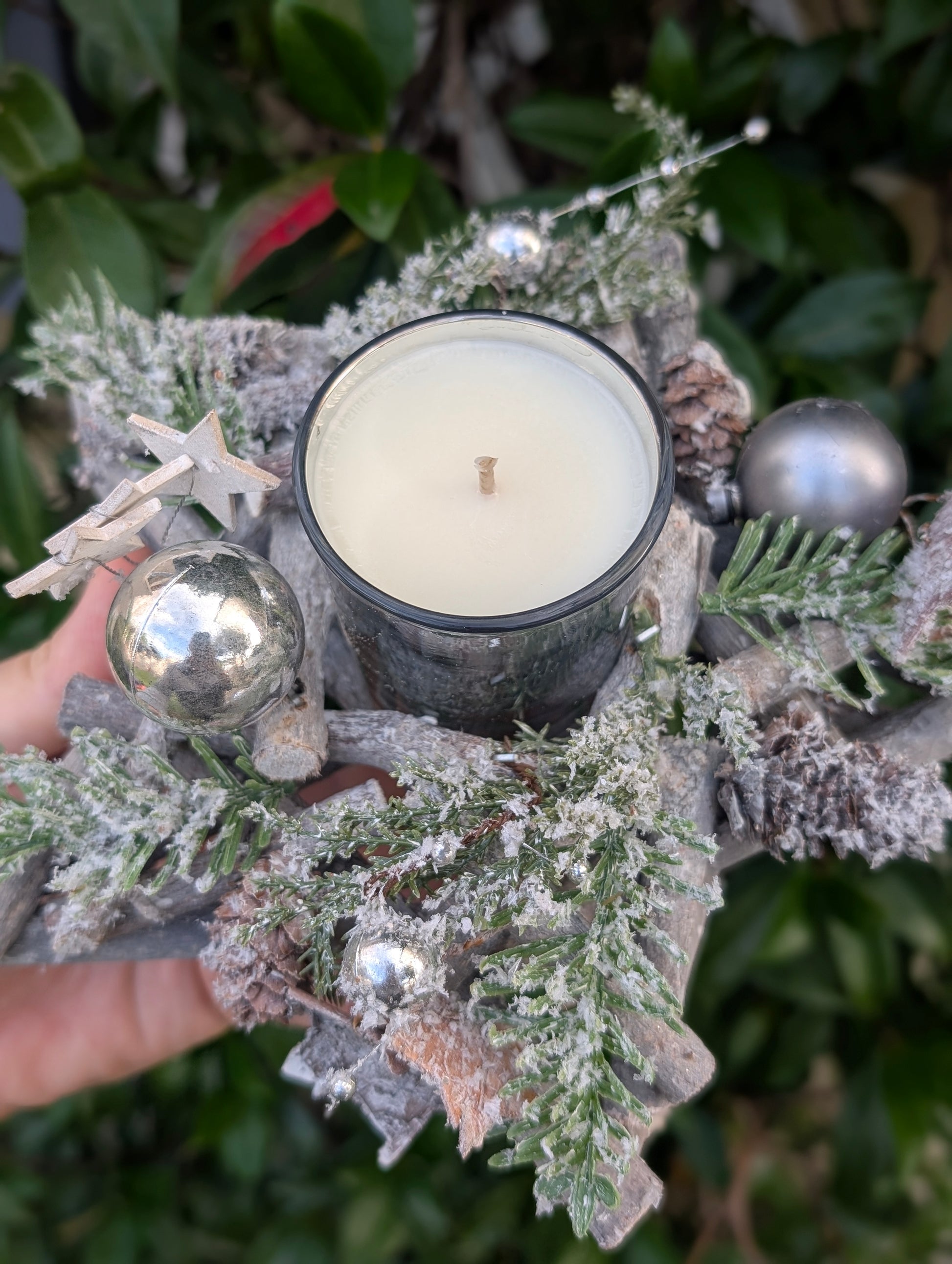 Couronne de Noël argentée - Bougie "Patate Douce Sucrée" ou Madeleine Gourmande